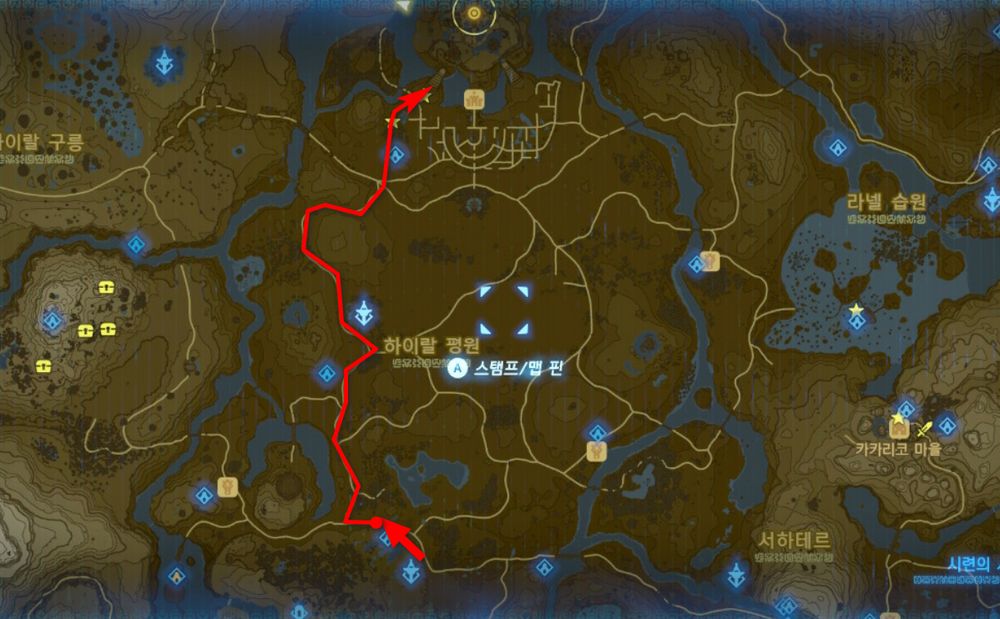 이 글에서는 시작의 탑에서 하이랄 성으로 가기 위해 아래 이미지의 경로대로 이동하게 될 것입니다.