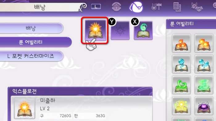 마법 강화를 위해서는 배낭 → 룬 어빌리티 에서 마법을 손바닥 위에 올립니다.
