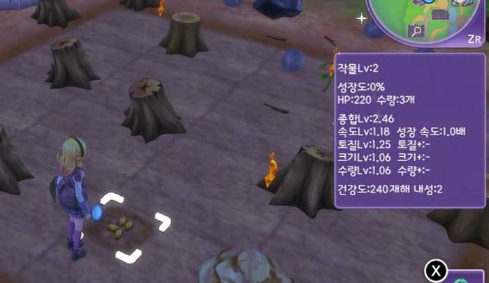돋보기 아이템을 장착하면 밭의 토질을 조사할 수 있으며, 작물Lv, 성장도, HP, 수량, 성장속도, 크기, 건강도, 재해 내성 등 다양한 정보를 얻을 수 있습니다.