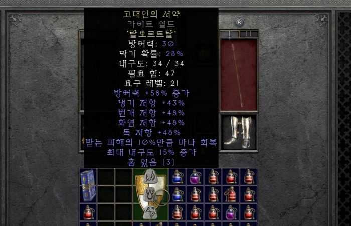 방어력은 물론 각종 저항 수치를 크게 올려주기 때문에, 높은 난이도로 진행할때 굉장히 유용합니다. 루트 골레인의 '파라'가 홈이 3개 있는 방패(카이트 쉴드)를 파는 경우가 있으니 한번 가보는 것도 좋을 것입니다.