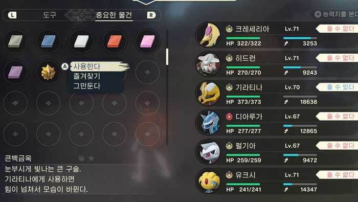 - 아르세우스와의 배틀때는 기절해버린 포켓몬을 회복시키는 기력의덩어리를 여러개 챙겨가는 것이 좋습니다.