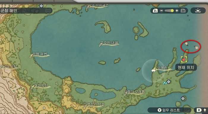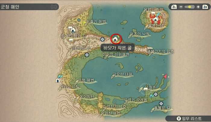 장침바루, 브이젤, 타만타 3마리 포켓몬을 모두 소지한 채로, 군청해안의 베이스캠프 '해안 기지'로 이동합니다.