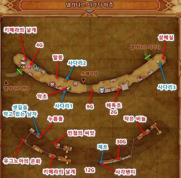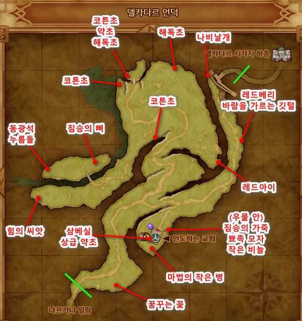 - 델카다르 시가지 하층으로 들어가기 전, 북동쪽 길가의 반짝이는 열매 나무에서 '레드베리'를 획득해 놓는 것이 좋습니다. (추후 스토리 진행에 필요합니다. 위치는 아래 이미지 참고)