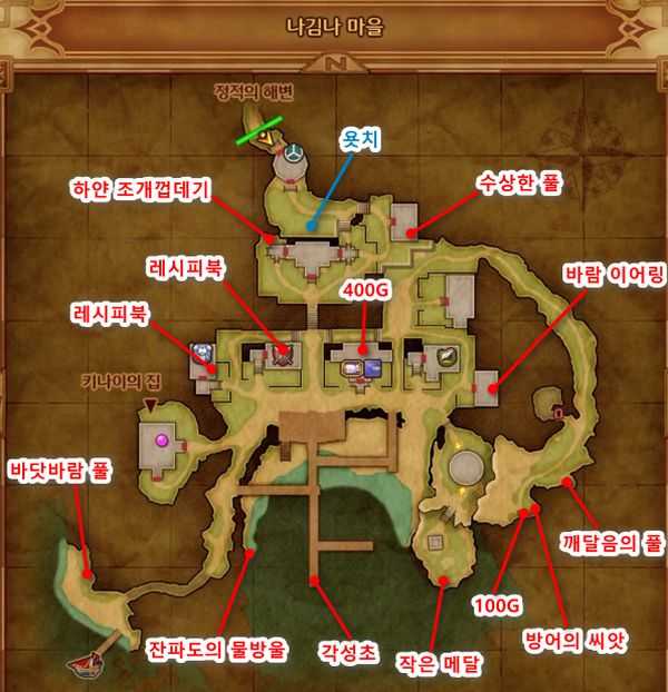 - 나김나 마을 무기 상점 건물 주인 뒤의 보물상자에서 '레시피북 - 악을 멸하는 검의 서'(파사의 검의 레시피) 획득