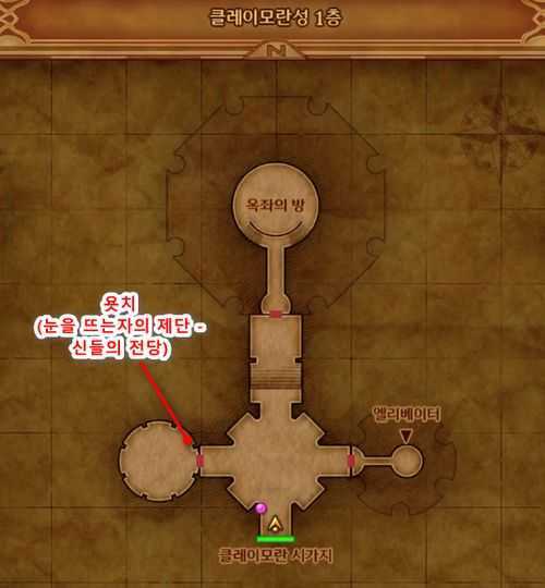 1. 클레이모란 성 1층 서쪽의 '여왕의 개인실'에 있는 욧치와 대화하여 '눈을 뜨는자의 제단'의 '신들의 전당'으로 가는 암호를 획득합니다.
