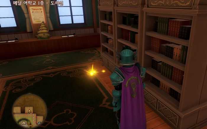 4. 메달 여학교로 이동합니다. 메달 여학교 1층 도서관 바닥에 반짝반짝 노랗게 빛나는 것을 조사하여 '탱탱한 아가씨 백서'를 획득합니다.
