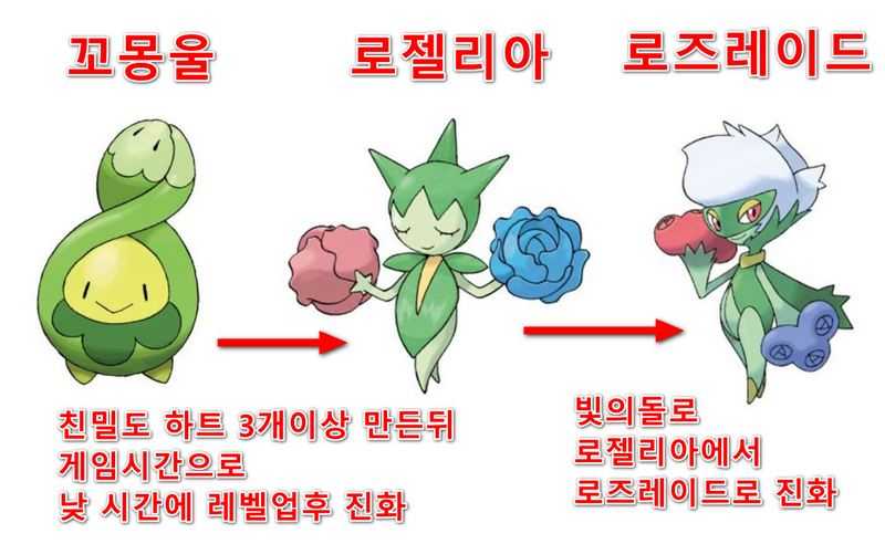 | 교배 | 로젤리아, 로즈레이드에게 꽃향로 아이템을 지니게 한뒤, 교배하면 꼬몽울 부화 | |