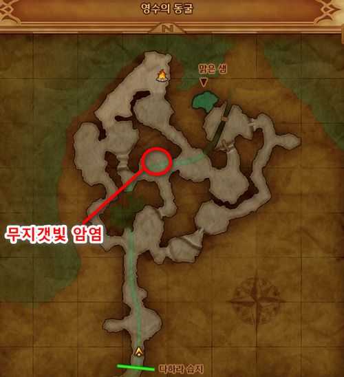 3. 영수의 동굴 중앙 부근에서 노랗게 반짝이는 것을 조사하여 '무지갯빛 암염'을 획득합니다.