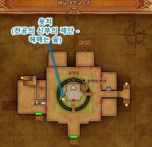 1. 메달 여학교 1층 교장실 건물 좌측 벽쪽에 있는 욧치와 대화하여 '천공의 신부의 제단'에 '헤매는 숲'으로 가는 암호를 획득합니다.