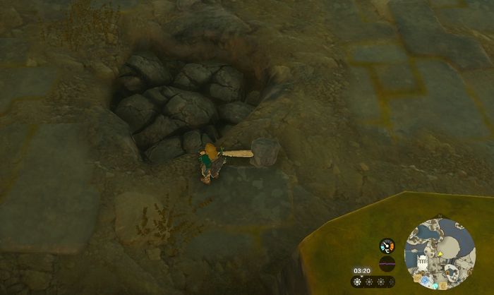 그러면 계단이 있으므로 계단을 내려가면 아래 이미지와 같이 바닥에 금이 간 바위가 보일 것입니다.
