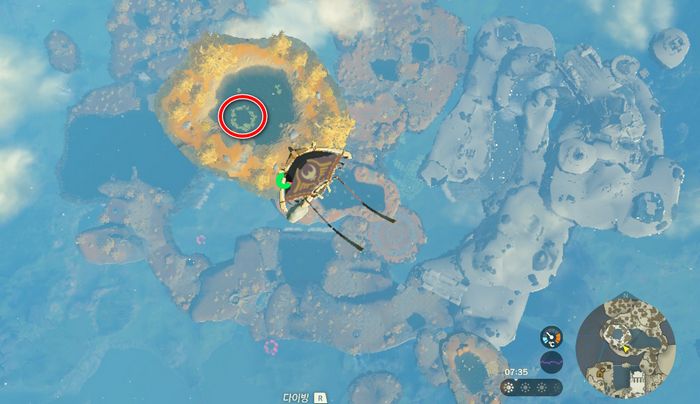 그러면 아래 이미지에 보이는 공중 섬이 있습니다. 그 섬의 연못에 연꽃잎으로 된 녹색 링이 보입니다.